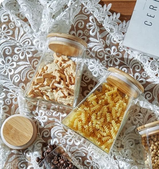 Frasco de vidrio c/tapa de bambu 950 ml base cuadrada