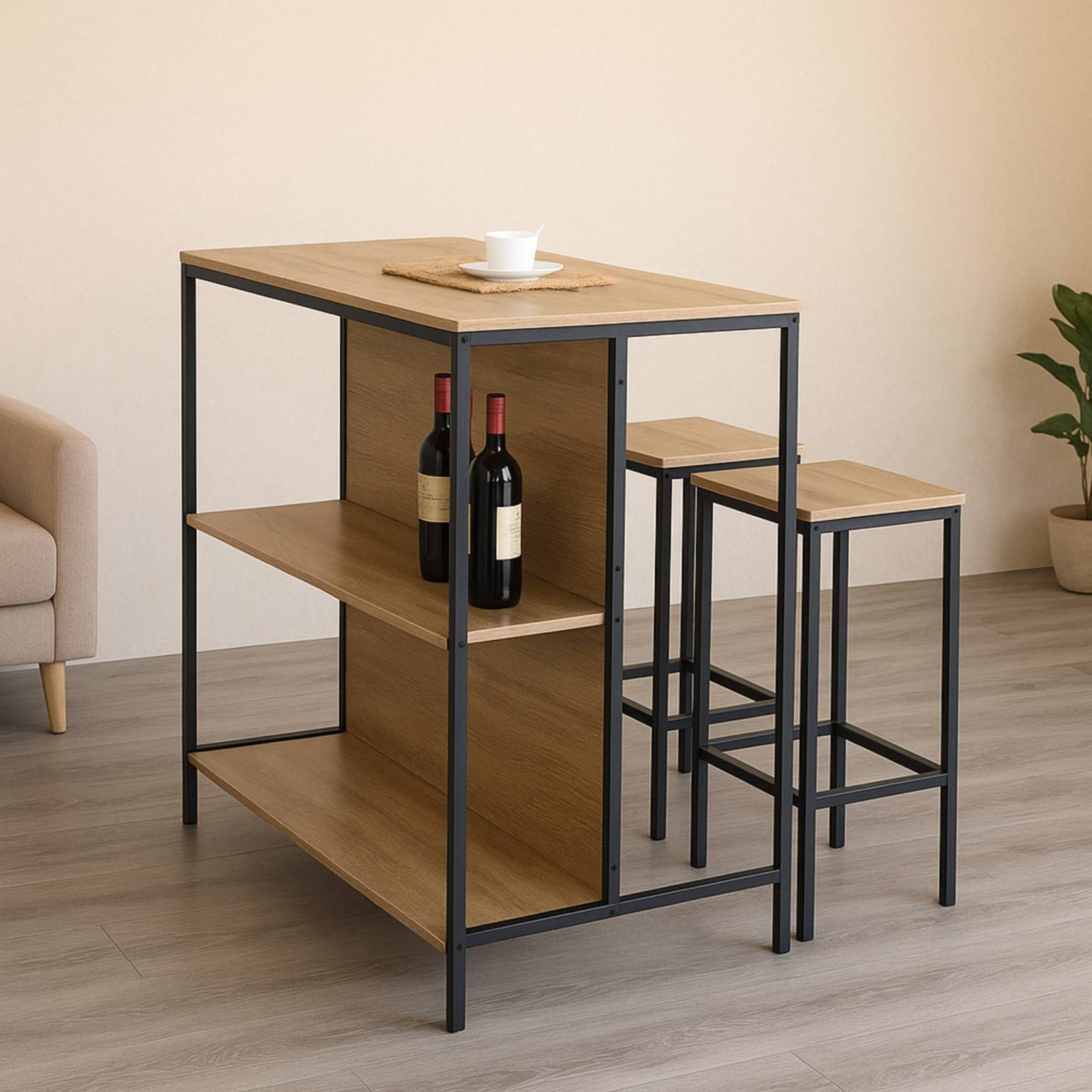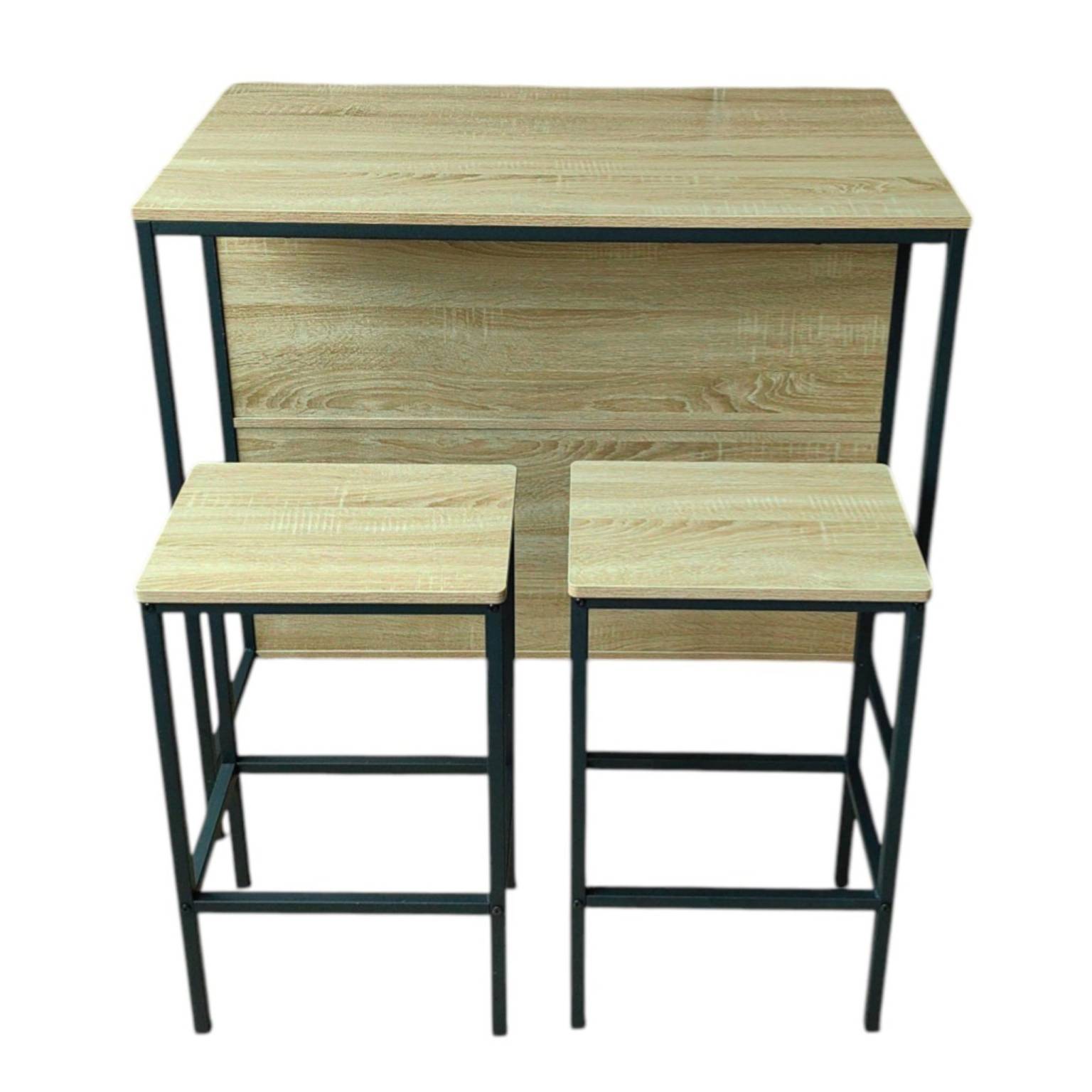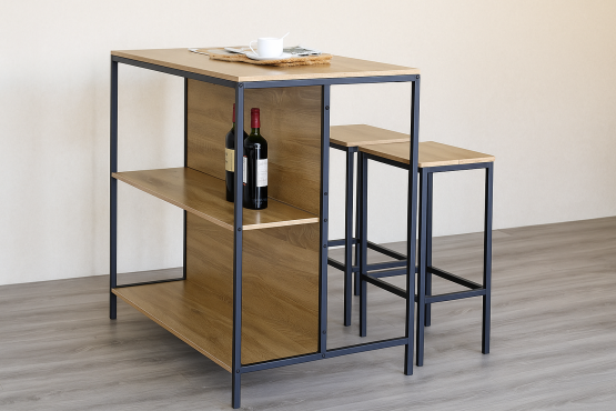 Transformá tu cocina o comedor con este elegante desayunador de hierro y madera con butacas, ideal para espacios modernos y multifuncionales. Su diseño compacto con estantes incorporados y dos asientos incluidos lo convierte en una opción práctica y con mucho estilo para tu hogar.